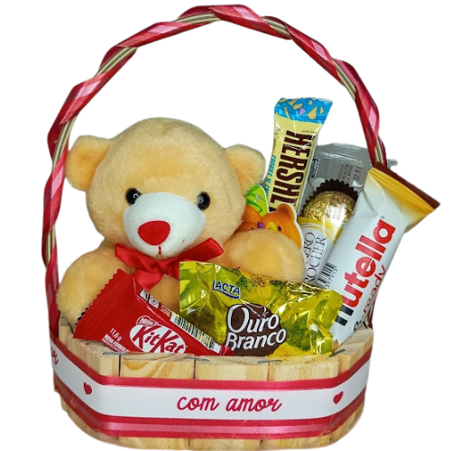 CESTA 06-Pelúcia 13cm+Caneca Porcelana 325ml+Chocolates Variados