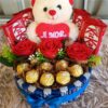CESTA 01-Pelúcia 20cm+Flores Permanentes+Chocolates Variados+Balão